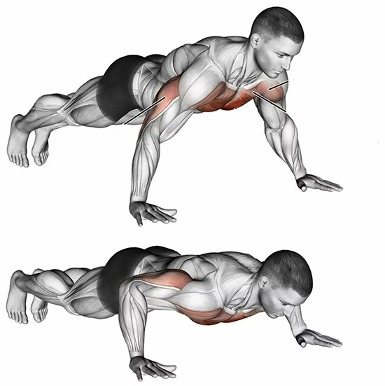Особенно важно, что плечевой пояс в отжиманиях проходит более естественную траекторию, снижая нагрузку на плечевые суставы. Для дома это упражнение заменяет и жим штанги, и разгибания на трицепс, и половину планок: кор вынужден держать тело прямой стабильной линией.